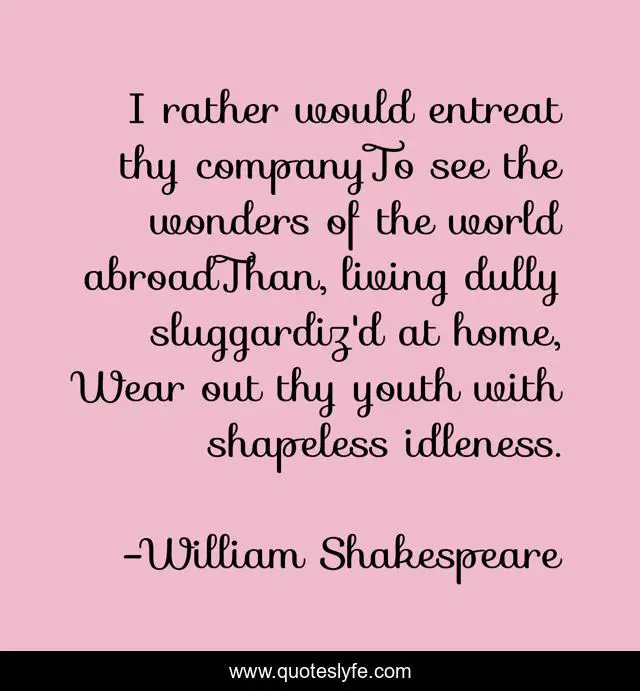 This page presents the quote "I rather would entreat thy companyTo see the wonders of the world abroadThan, living dully sluggardiz'd at home, Wear out thy youth with shapeless idleness.". Author of this quote is William Shakespeare. This quote is about youth, idleness,.