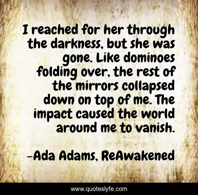 This page presents the quote "I reached for her through the darkness, but she was gone. Like dominoes folding over, the rest of the mirrors collapsed down on top of me. The impact caused the world around me to vanish.". Author of this quote is Ada Adams, ReAwakened. This quote is about vanished, mirrors, dawn, darkness,.