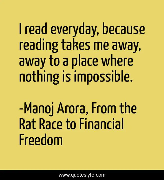 This page presents the quote "I read everyday, because reading takes me away, away to a place where nothing is impossible.". Author of this quote is Manoj Arora, From the Rat Race to Financial Freedom. This quote is about nothing-is-impossible, read, reading-books, books, impossible, reading, book, reading-habits,.