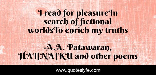 This page presents the quote "I read for pleasureIn search of fictional worldsTo enrich my truths". Author of this quote is A.A. Patawaran, HAI[NA]KU and other poems. This quote is about reading, poetry,.