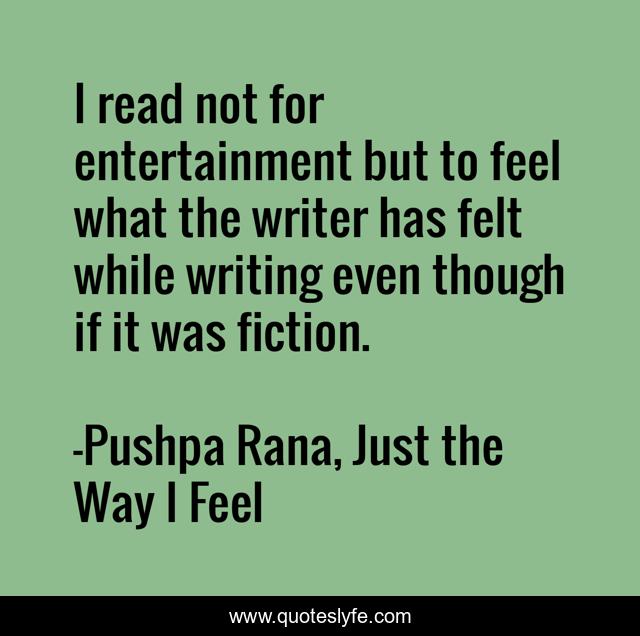 This page presents the quote "I read not for entertainment but to feel what the writer has felt while writing even though if it was fiction.". Author of this quote is Pushpa Rana, Just the Way I Feel. This quote is about fiction, admiration, felt, love, entertainment, feel, writer, feelings, appreciation,.