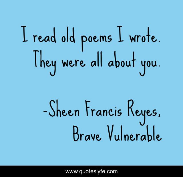 This page presents the quote "I read old poems I wrote. They were all about you.". Author of this quote is Sheen Francis Reyes, Brave Vulnerable. This quote is about romance, love, love-poem, affection, poetry,.