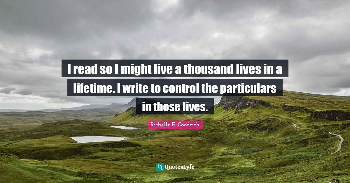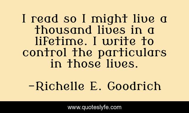This page presents the quote "I read so I might live a thousand lives in a lifetime. I write to control the particulars in those lives.". Author of this quote is Richelle E. Goodrich. This quote is about life, richelle, author, read, richelle-e-goodrich, writing, write, fantasy, lives,.