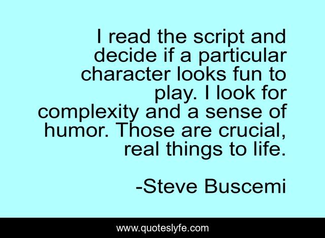 This page presents the quote "I read the script and decide if a particular character looks fun to play. I look for complexity and a sense of humor. Those are crucial, real things to life.". Author of this quote is Steve Buscemi. This quote is about fun, life, character,.
