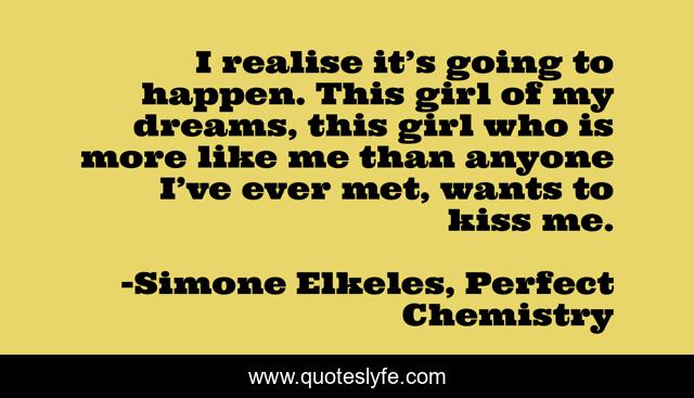 This page presents the quote "I realise it’s going to happen. This girl of my dreams, this girl who is more like me than anyone I’ve ever met, wants to kiss me.". Author of this quote is Simone Elkeles, Perfect Chemistry. This quote is about romance, young-adult-fiction, young-adult-romance,.