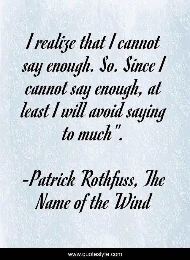 This page presents the quote "I realize that I cannot say enough. So. Since I cannot say enough, at least I will avoid saying to much".". Author of this quote is Patrick Rothfuss, The Name of the Wind. .
