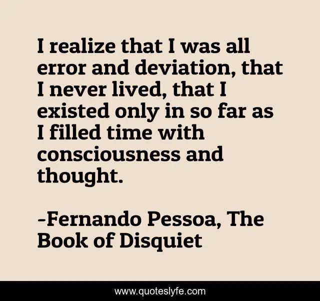 This page presents the quote "I realize that I was all error and deviation, that I never lived, that I existed only in so far as I filled time with consciousness and thought.". Author of this quote is Fernando Pessoa, The Book of Disquiet. .