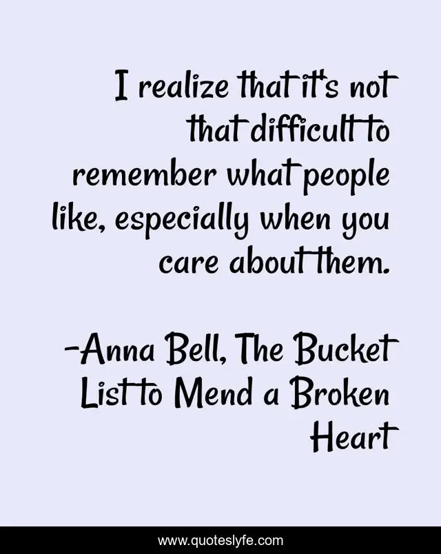 This page presents the quote "I realize that it's not that difficult to remember what people like, especially when you care about them.". Author of this quote is Anna Bell, The Bucket List to Mend a Broken Heart. This quote is about broken-heart, break-up, love, bucket-list, affection,.