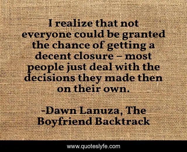 This page presents the quote "I realize that not everyone could be granted the chance of getting a decent closure – most people just deal with the decisions they made then on their own.". Author of this quote is Dawn Lanuza, The Boyfriend Backtrack. This quote is about closure, dawn-lanuza, peace, decisions, moving-on, the-boyfriend-backtrack,.