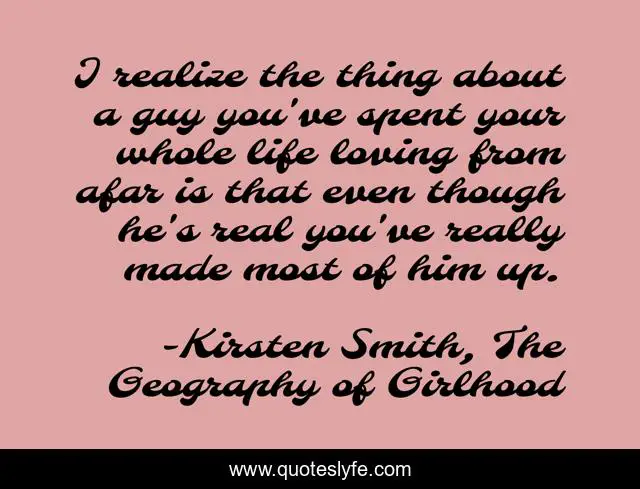 This page presents the quote "I realize the thing about a guy you've spent your whole life loving from afar is that even though he's real you've really made most of him up.". Author of this quote is Kirsten Smith, The Geography of Girlhood. This quote is about relationships, love, affection,.