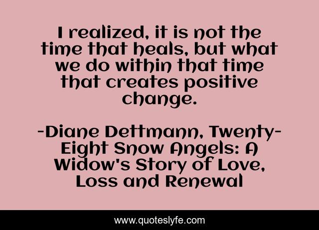 This page presents the quote "I realized, it is not the time that heals, but what we do within that time that creates positive change.". Author of this quote is Diane Dettmann, Twenty-Eight Snow Angels: A Widow's Story of Love, Loss and Renewal. This quote is about loss, spouse, widows, grief-inspirational, renewal,.