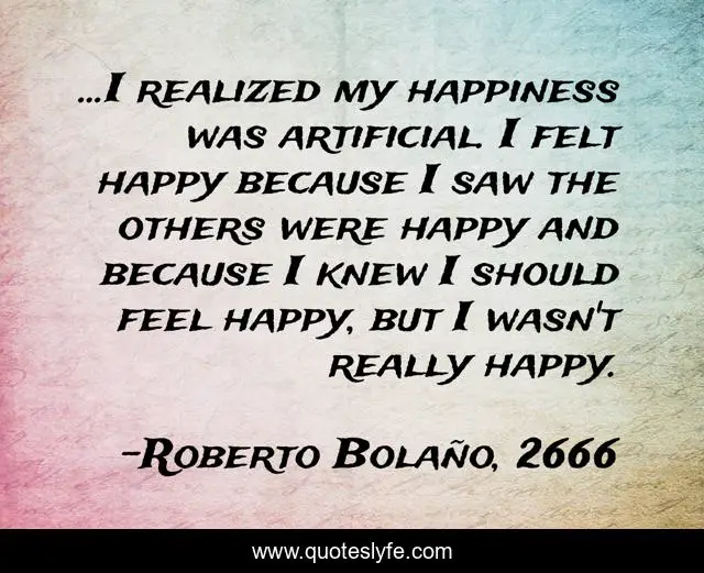 This page presents the quote "…I realized my happiness was artificial. I felt happy because I saw the others were happy and because I knew I should feel happy, but I wasn't really happy.". Author of this quote is Roberto Bolaño, 2666. .
