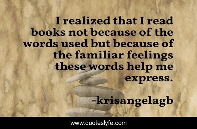This page presents the quote "I realized that I read books not because of the words used but because of the familiar feelings these words help me express.". Author of this quote is krisangelagb. This quote is about reading, expressing-yourself, feelings,.