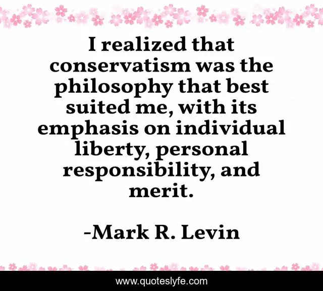 This page presents the quote "I realized that conservatism was the philosophy that best suited me, with its emphasis on individual liberty, personal responsibility, and merit.". Author of this quote is Mark R. Levin. This quote is about philosophy, responsibility, liberty, merit,.