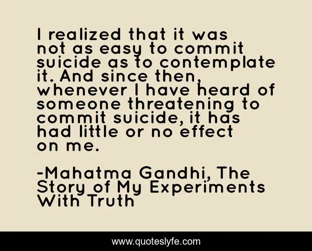 This page presents the quote "I realized that it was not as easy to commit suicide as to contemplate it. And since then, whenever I have heard of someone threatening to commit suicide, it has had little or no effect on me.". Author of this quote is Mahatma Gandhi, The Story of My Experiments With Truth. .