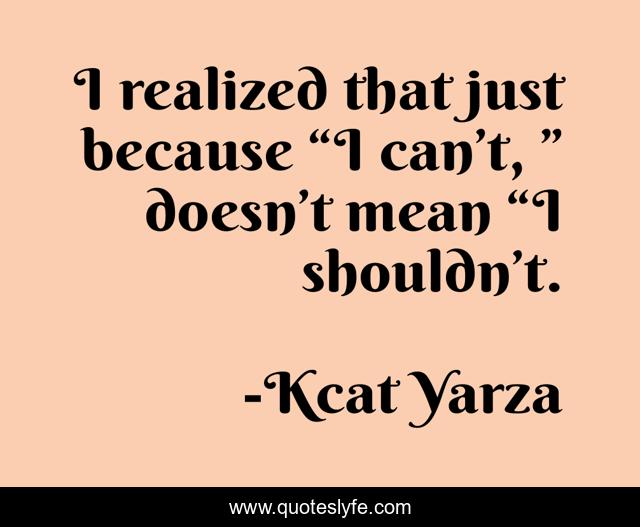 This page presents the quote "I realized that just because “I can’t, ” doesn’t mean “I shouldn’t.". Author of this quote is Kcat Yarza. This quote is about lie, confidence, positive, motivational, optimistic, inspirational, enthusiasm,.