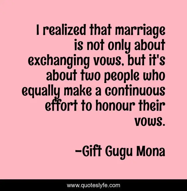 This page presents the quote "I realized that marriage is not only about exchanging vows, but it's about two people who equally make a continuous effort to honour their vows.". Author of this quote is Gift Gugu Mona. This quote is about two-people, exchanging-vows, marriage, continous-effort, honour-their-vows,.