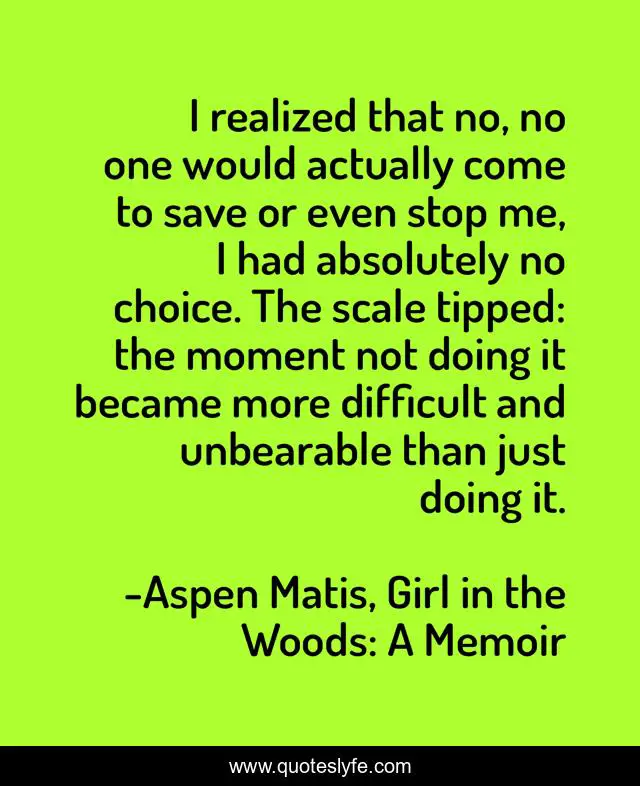 This page presents the quote "I realized that no, no one would actually come to save or even stop me, I had absolutely no choice. The scale tipped: the moment not doing it became more difficult and unbearable than just doing it.". Author of this quote is Aspen Matis, Girl in the Woods: A Memoir. This quote is about realisation, hiking-the-pct, aspen-matis, memoir, young-woman,.