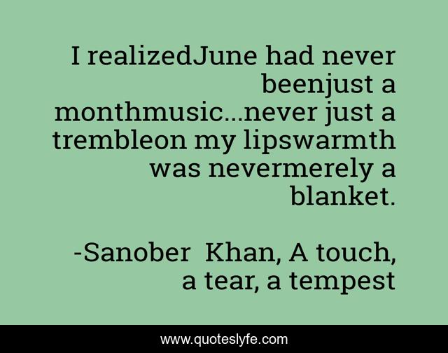 This page presents the quote "I realizedJune had never beenjust a monthmusic...never just a trembleon my lipswarmth was nevermerely a blanket.". Author of this quote is Sanober Khan, A touch, a tear, a tempest. This quote is about summer, blanket, months, june, poetry, lips, warm, music, tremble,.
