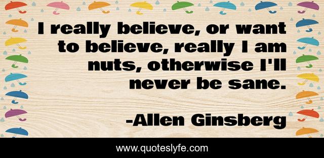 This page presents the quote "I really believe, or want to believe, really I am nuts, otherwise I'll never be sane.". Author of this quote is Allen Ginsberg. This quote is about sanity, humor, poetry,.