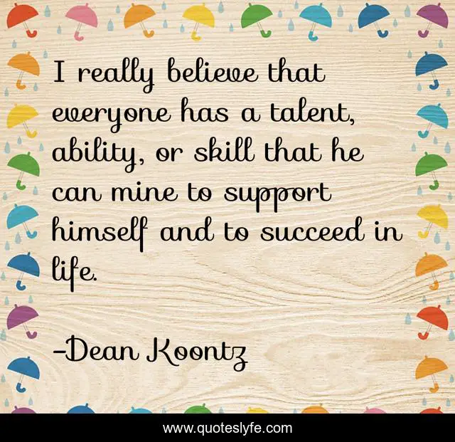 This page presents the quote "I really believe that everyone has a talent, ability, or skill that he can mine to support himself and to succeed in life.". Author of this quote is Dean Koontz. This quote is about life, believe, support,.