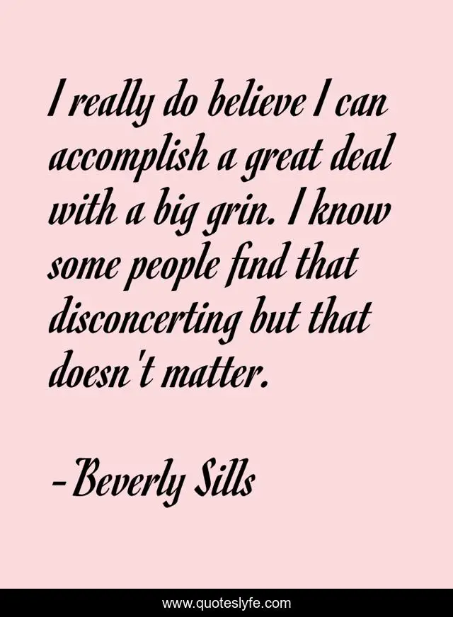 This page presents the quote "I really do believe I can accomplish a great deal with a big grin. I know some people find that disconcerting but that doesn't matter.". Author of this quote is Beverly Sills. .
