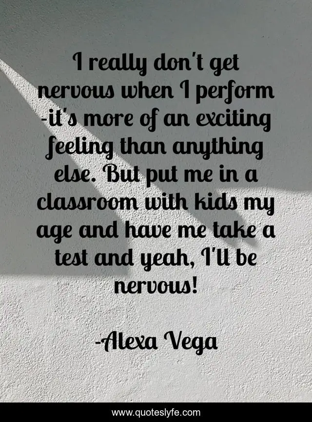 This page presents the quote "I really don't get nervous when I perform -it's more of an exciting feeling than anything else. But put me in a classroom with kids my age and have me take a test and yeah, I'll be nervous!". Author of this quote is Alexa Vega. This quote is about me, test, kids,.