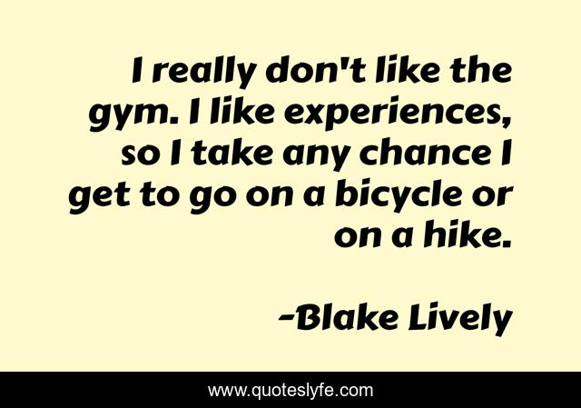 This page presents the quote "I really don't like the gym. I like experiences, so I take any chance I get to go on a bicycle or on a hike.". Author of this quote is Blake Lively. This quote is about bicycle, gym, experiences,.