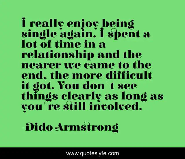 This page presents the quote "I really enjoy being single again. I spent a lot of time in a relationship and the nearer we came to the end, the more difficult it got. You don't see things clearly as long as you're still involved.". Author of this quote is Dido Armstrong. This quote is about alone, enjoy, time,.