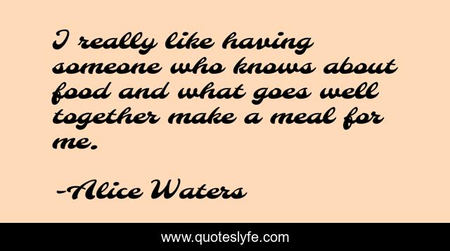 This page presents the quote "I really like having someone who knows about food and what goes well together make a meal for me.". Author of this quote is Alice Waters. This quote is about me, well, together,.