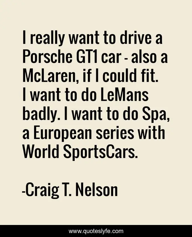 This page presents the quote "I really want to drive a Porsche GT1 car - also a McLaren, if I could fit. I want to do LeMans badly. I want to do Spa, a European series with World SportsCars.". Author of this quote is Craig T. Nelson. This quote is about world, drive,.