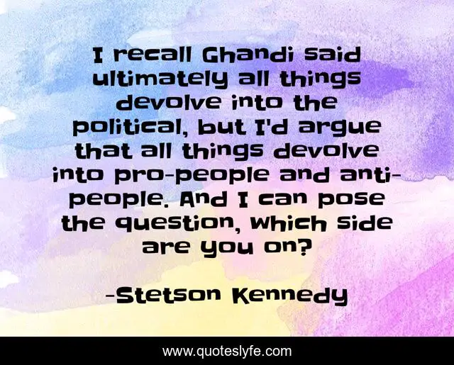 This page presents the quote "I recall Ghandi said ultimately all things devolve into the political, but I'd argue that all things devolve into pro-people and anti-people. And I can pose the question, which side are you on?". Author of this quote is Stetson Kennedy. This quote is about civil-rights, equality,.