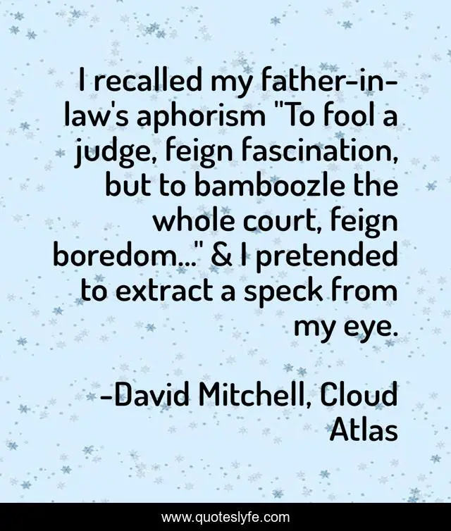 This page presents the quote "I recalled my father-in-law's aphorism "To fool a judge, feign fascination, but to bamboozle the whole court, feign boredom..." & I pretended to extract a speck from my eye.". Author of this quote is David Mitchell, Cloud Atlas. This quote is about human-nature, advice,.