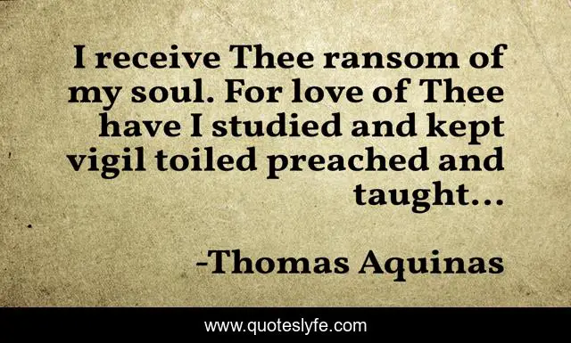 This page presents the quote "I receive Thee ransom of my soul. For love of Thee have I studied and kept vigil toiled preached and taught…". Author of this quote is Thomas Aquinas. This quote is about god, prayer, enthusiasm, inspirational, wisdom,.