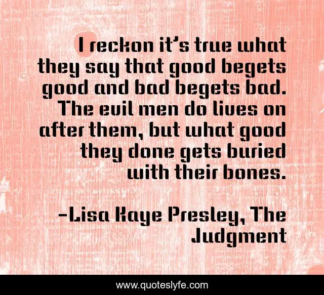 This page presents the quote "I reckon it’s true what they say that good begets good and bad begets bad. The evil men do lives on after them, but what good they done gets buried with their bones.". Author of this quote is Lisa Kaye Presley, The Judgment. This quote is about mystery, historical-fiction, southern-fiction,.