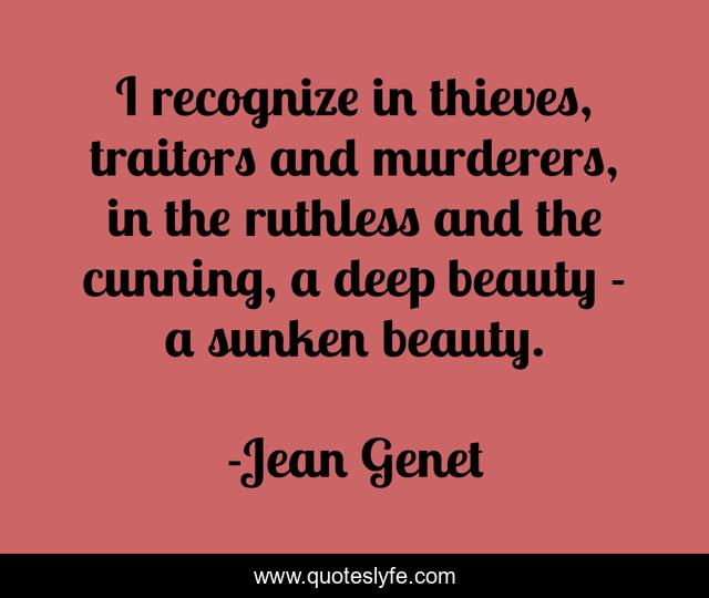 This page presents the quote "I recognize in thieves, traitors and murderers, in the ruthless and the cunning, a deep beauty - a sunken beauty.". Author of this quote is Jean Genet. This quote is about traitors, deep, cunning,.