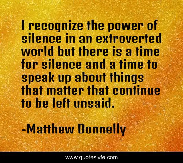 This page presents the quote "I recognize the power of silence in an extroverted world but there is a time for silence and a time to speak up about things that matter that continue to be left unsaid.". Author of this quote is Matthew Donnelly. This quote is about speak-up, introvert, extrovert, power, silence,.