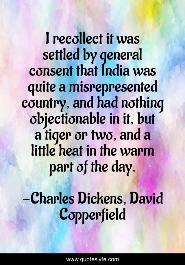 This page presents the quote "I recollect it was settled by general consent that India was quite a misrepresented country, and had nothing objectionable in it, but a tiger or two, and a little heat in the warm part of the day.". Author of this quote is Charles Dickens, David Copperfield. .