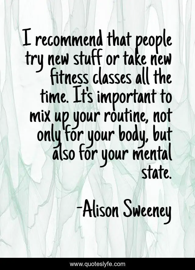 This page presents the quote "I recommend that people try new stuff or take new fitness classes all the time. It's important to mix up your routine, not only for your body, but also for your mental state.". Author of this quote is Alison Sweeney. This quote is about body, time, people,.