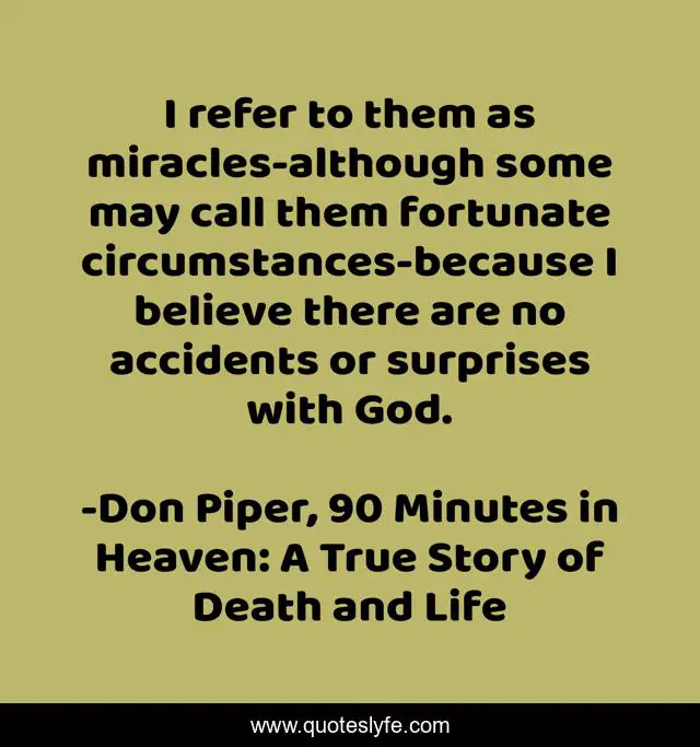 This page presents the quote "I refer to them as miracles-although some may call them fortunate circumstances-because I believe there are no accidents or surprises with God.". Author of this quote is Don Piper, 90 Minutes in Heaven: A True Story of Death and Life. .