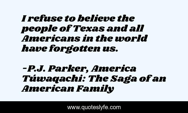 This page presents the quote "I refuse to believe the people of Texas and all Americans in the world have forgotten us.". Author of this quote is P.J. Parker, America Túwaqachi: The Saga of an American Family. This quote is about historical-novel, romance, adult, inspirational, enthusiasm, american-history, young-adult, adventure,.