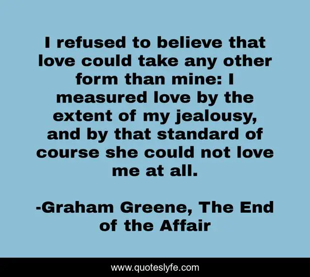 This page presents the quote "I refused to believe that love could take any other form than mine: I measured love by the extent of my jealousy, and by that standard of course she could not love me at all.". Author of this quote is Graham Greene, The End of the Affair. This quote is about jealousy, love, affection,.