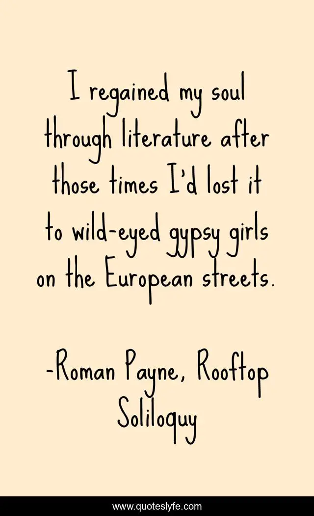 This page presents the quote "I regained my soul through literature after those times I'd lost it to wild-eyed gypsy girls on the European streets.". Author of this quote is Roman Payne, Rooftop Soliloquy. This quote is about europe, literature, fortune, roman-payne, streets, fortunes, gypsies, payne, gypsy,.