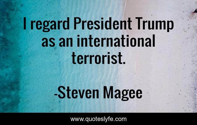 This page presents the quote "I regard President Trump as an international terrorist.". Author of this quote is Steven Magee. This quote is about terrorist, psychology, usa, poltics, president, international, terrorism, war, trump,.