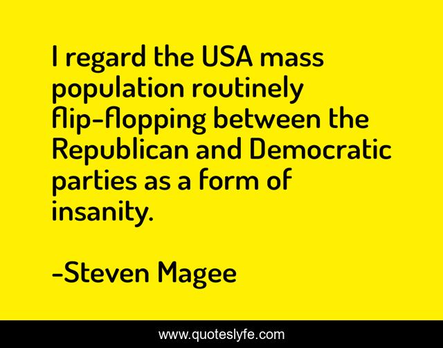 This page presents the quote "I regard the USA mass population routinely flip-flopping between the Republican and Democratic parties as a form of insanity.". Author of this quote is Steven Magee. This quote is about democratic, routinely, usa, form, masses, regard, flip, insanity, flopping,.