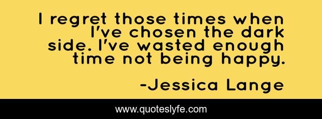 This page presents the quote "I regret those times when I've chosen the dark side. I've wasted enough time not being happy.". Author of this quote is Jessica Lange. This quote is about being happy, regret, happy,.