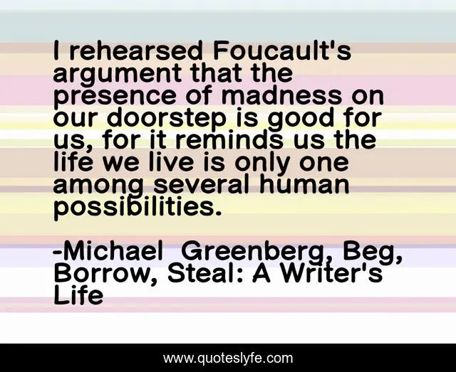 This page presents the quote "I rehearsed Foucault's argument that the presence of madness on our doorstep is good for us, for it reminds us the life we live is only one among several human possibilities.". Author of this quote is Michael Greenberg, Beg, Borrow, Steal: A Writer's Life. This quote is about madness, mental-illness, insanity,.
