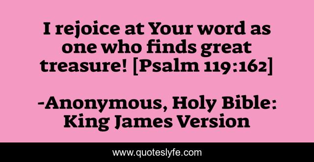 This page presents the quote "I rejoice at Your word as one who finds great treasure! [Psalm 119:162]". Author of this quote is Anonymous, Holy Bible: King James Version. This quote is about bible, scripture, bible-verse,.