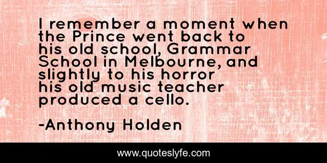 This page presents the quote "I remember a moment when the Prince went back to his old school, Grammar School in Melbourne, and slightly to his horror his old music teacher produced a cello.". Author of this quote is Anthony Holden. This quote is about school, music, remember,.