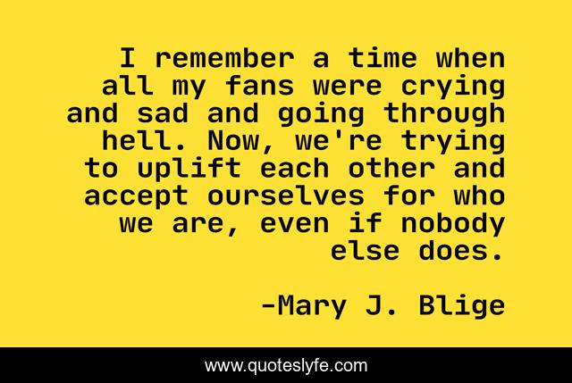 This page presents the quote "I remember a time when all my fans were crying and sad and going through hell. Now, we're trying to uplift each other and accept ourselves for who we are, even if nobody else does.". Author of this quote is Mary J. Blige. This quote is about hell, remember, time,.
